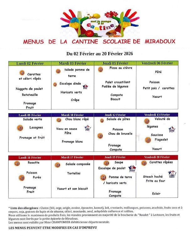 Menus de la cantine scolaire de Miradoux