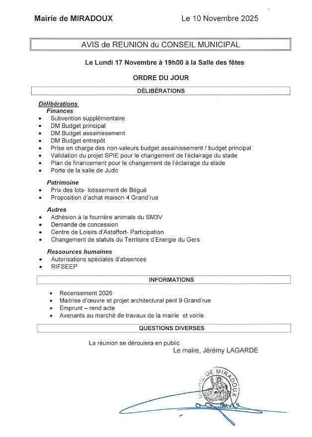 Avis de réunion du Conseil Municipal le Lundi 17 Novembre à 19h à la salle des fêtes de Miradoux