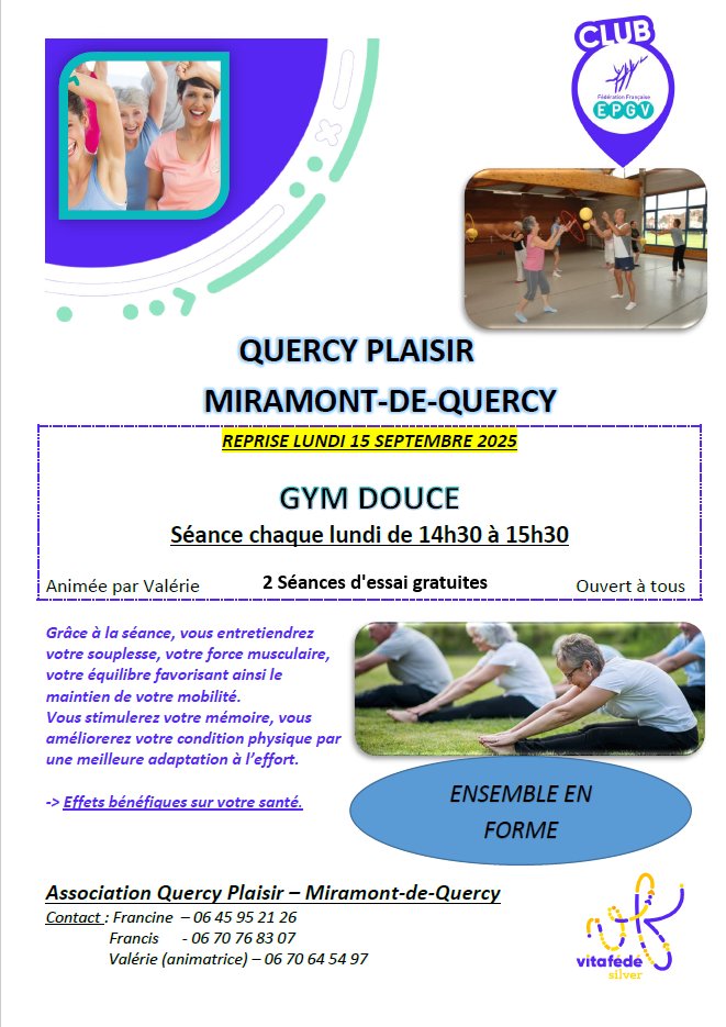 QUERCY PLAISIR propose des séances de GYM DOUCE le lundi après-midi de 14h30 à 15h30