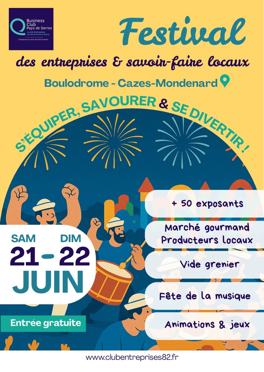 La 3eme édition du festival des entreprises et des savoir-faire locaux, organisé par le Club des entreprises du Pays de Serres en Quercy, le Business Club Pays de Serres, se déroulera cette année le 21 & 22 Juin à Cazes-Mondenard!