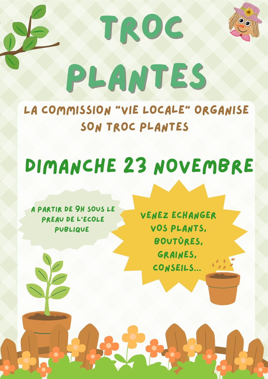 la commission municipale "Vie Locale" organise son 4e TROC PLANTES, le dimanche 23 novembre de 9h à 12h sous le préau de l'école élémentaire publique. (Place de la Moinerie).
