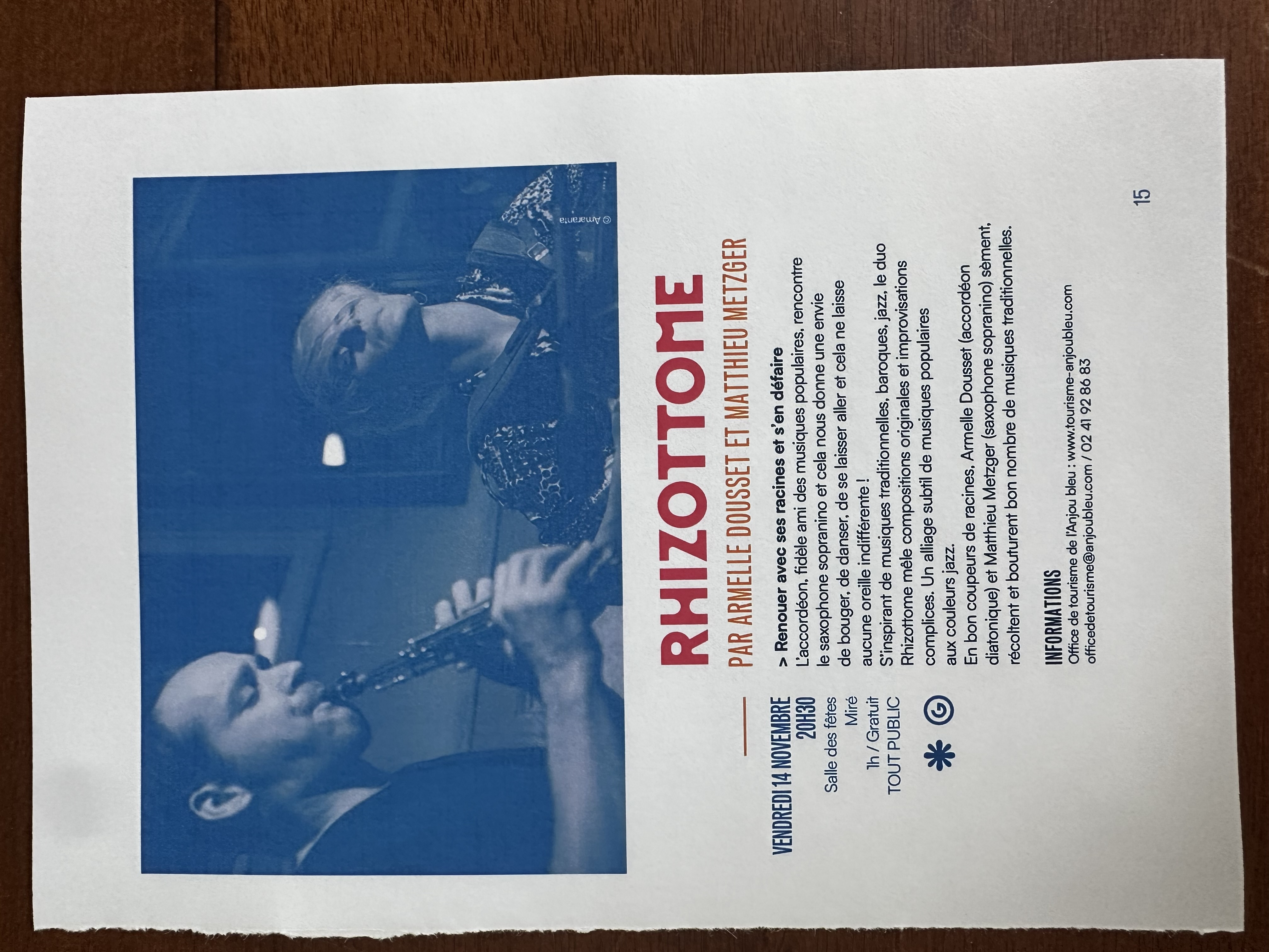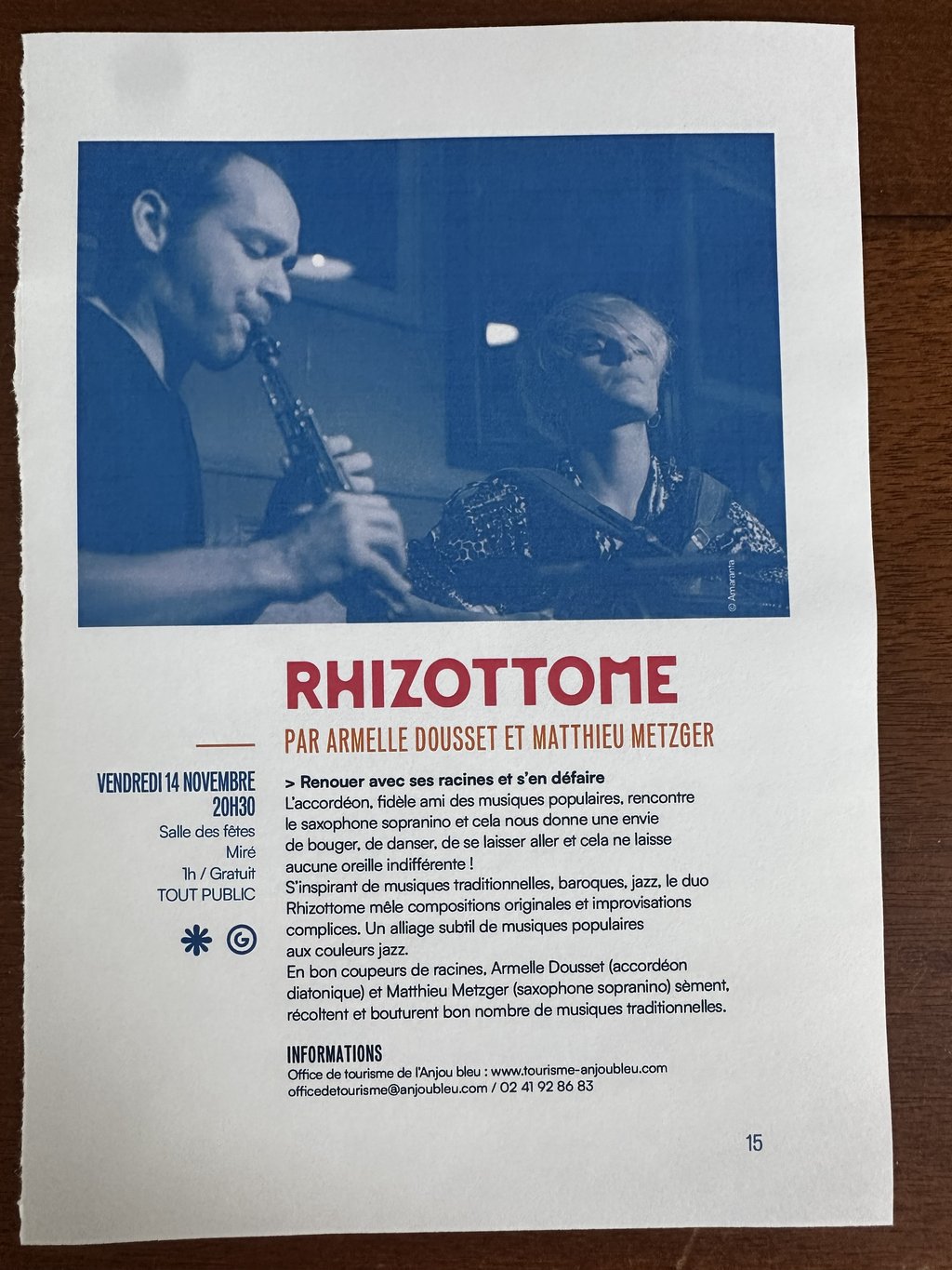 S'inspirant des musiques traditionnelles, baroques, jazz, le duo RHIZOTTOME mêle compositions originales et improvisations complices. Un alliage subtil de musiques populaires aux couleurs jazz.