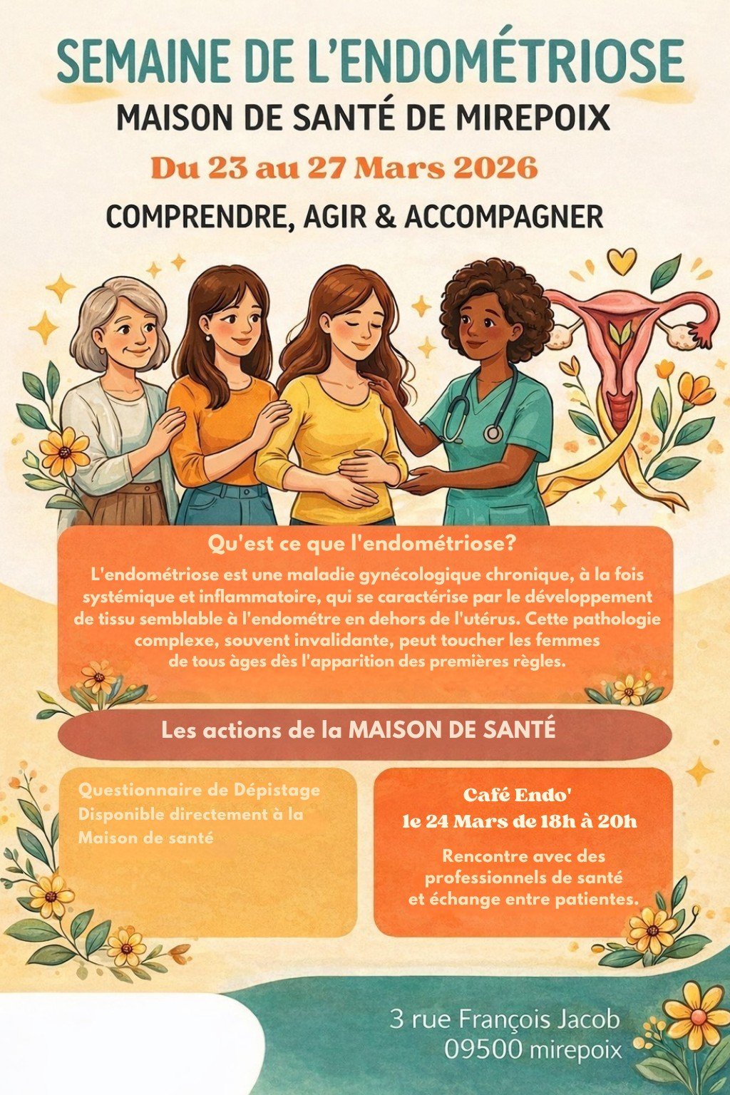 Du 23 au 27 mars, la Maison de Santé de Mirepoix se mobilise pour une semaine dédiée à la sensibilisation à l’endométriose, une maladie encore trop méconnue qui touche de nombreuses femmes.
