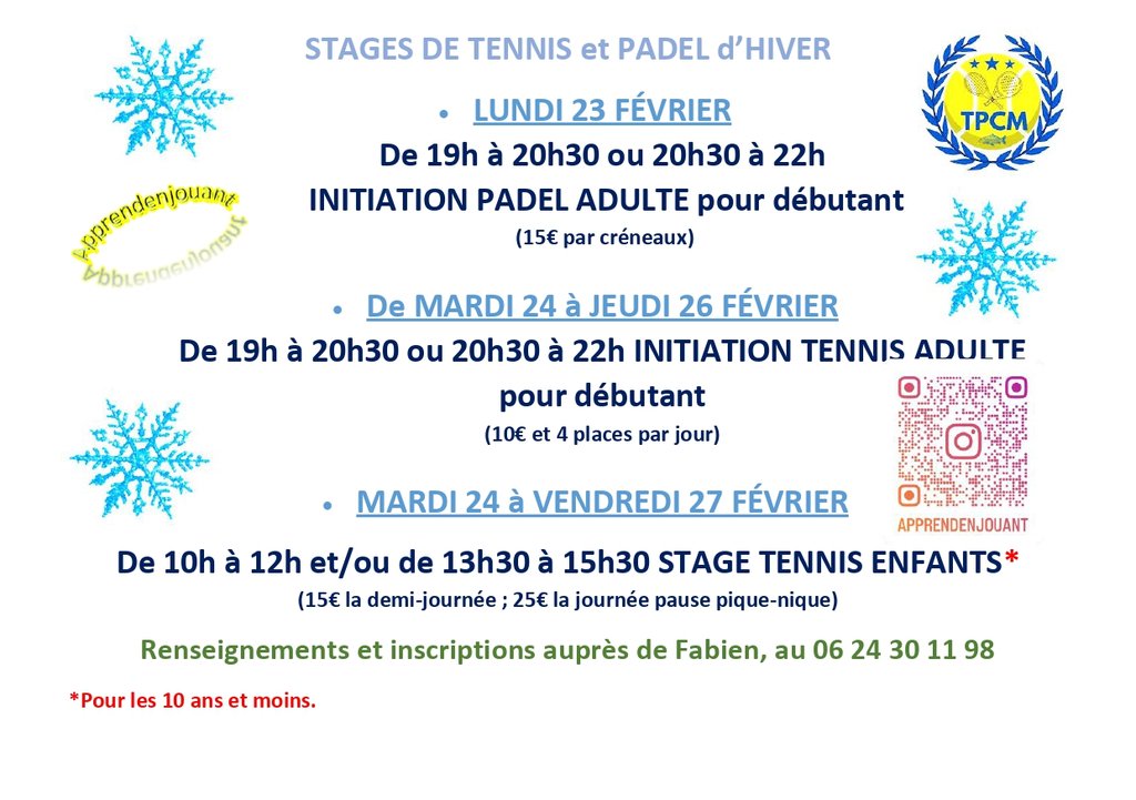 Le Tennis Padel Club de Mirepoix propose des stages de tennis et Padel d'hiver pour enfants et adultes :