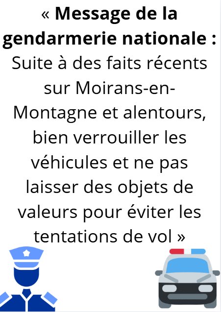 Suite à des faits récents sur Moirans-en-Montagne et alentours, bien verrouiller les véhicules et ne pas laisser des objets de valeurs pour éviter les tentations de vol »