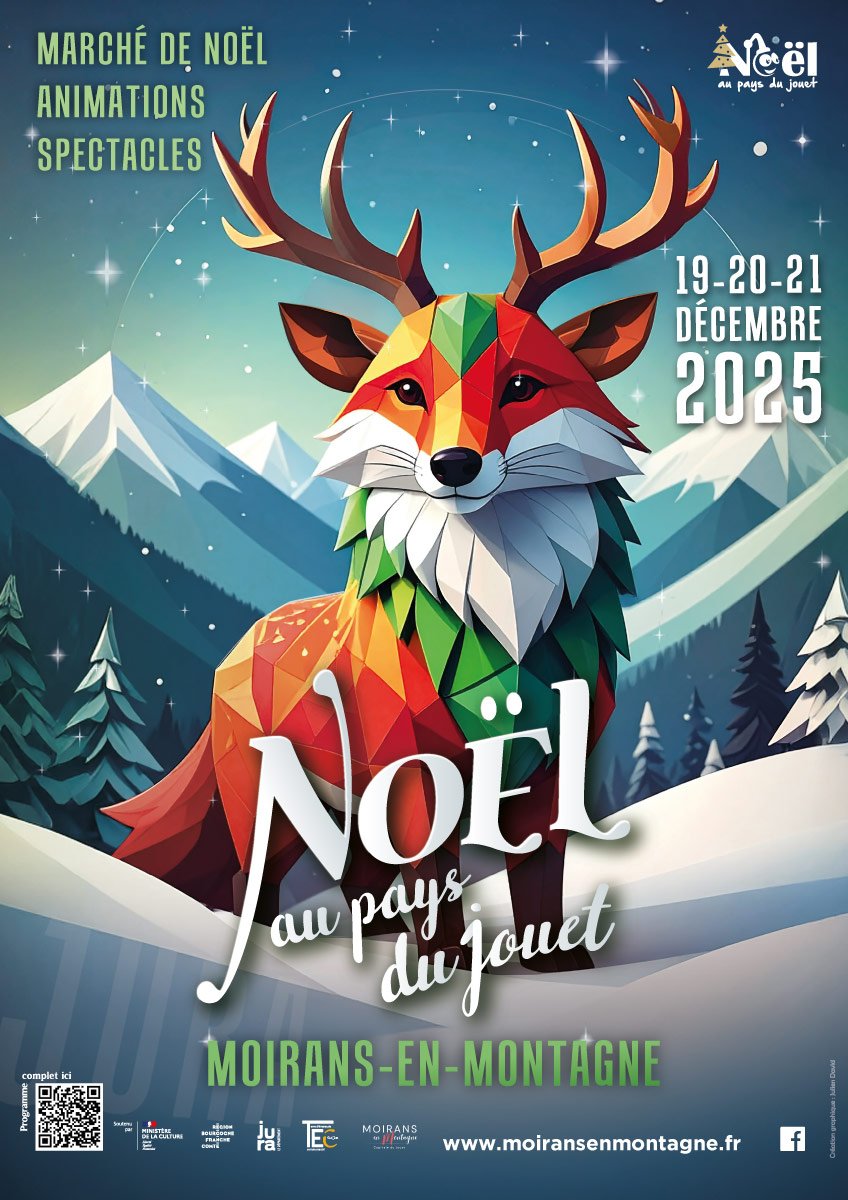 Nous avons le plaisir de vous présenter le programme de la 28ème édition de Noël au Pays du Jouet à Moirans-en-Montagne du 19 au 21 décembre prochain. Il est le fruit d'un travail d'équipe, les bénévoles de l'association en lien avec nos partenaires qui sont : le musée du jouet, la médiathèque, le cinéma, l'école de musique, l'accueil de loisirs, les écoles, les compagnies artistiques, l'association canine Jura Sud, le centre équestre Jura Sud, les sapeurs-pompiers de Moirans-en-Montagne... et bien sûr avec les concours financiers de la DRAC, de la Région BFC, du département du Jura, de Terre d'Emeraude, de la commune de Moirans-en-Montagne et des mécènes.