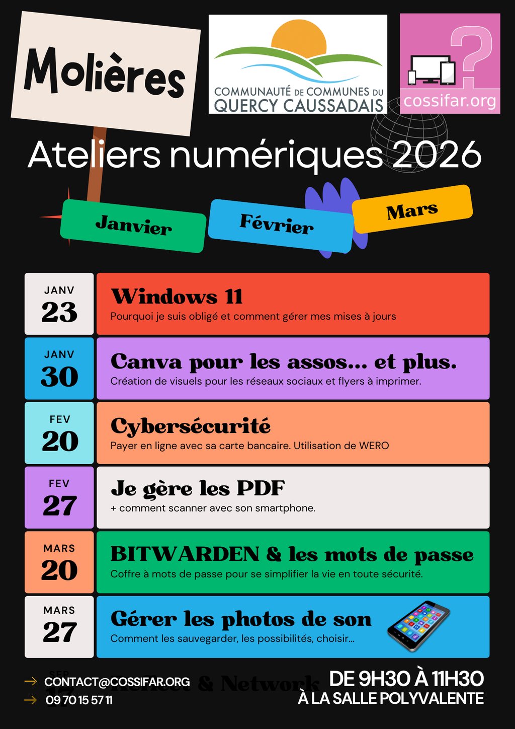 Programme des ateliers numériques prévus à Molières durant le 1er trimestre 2026.