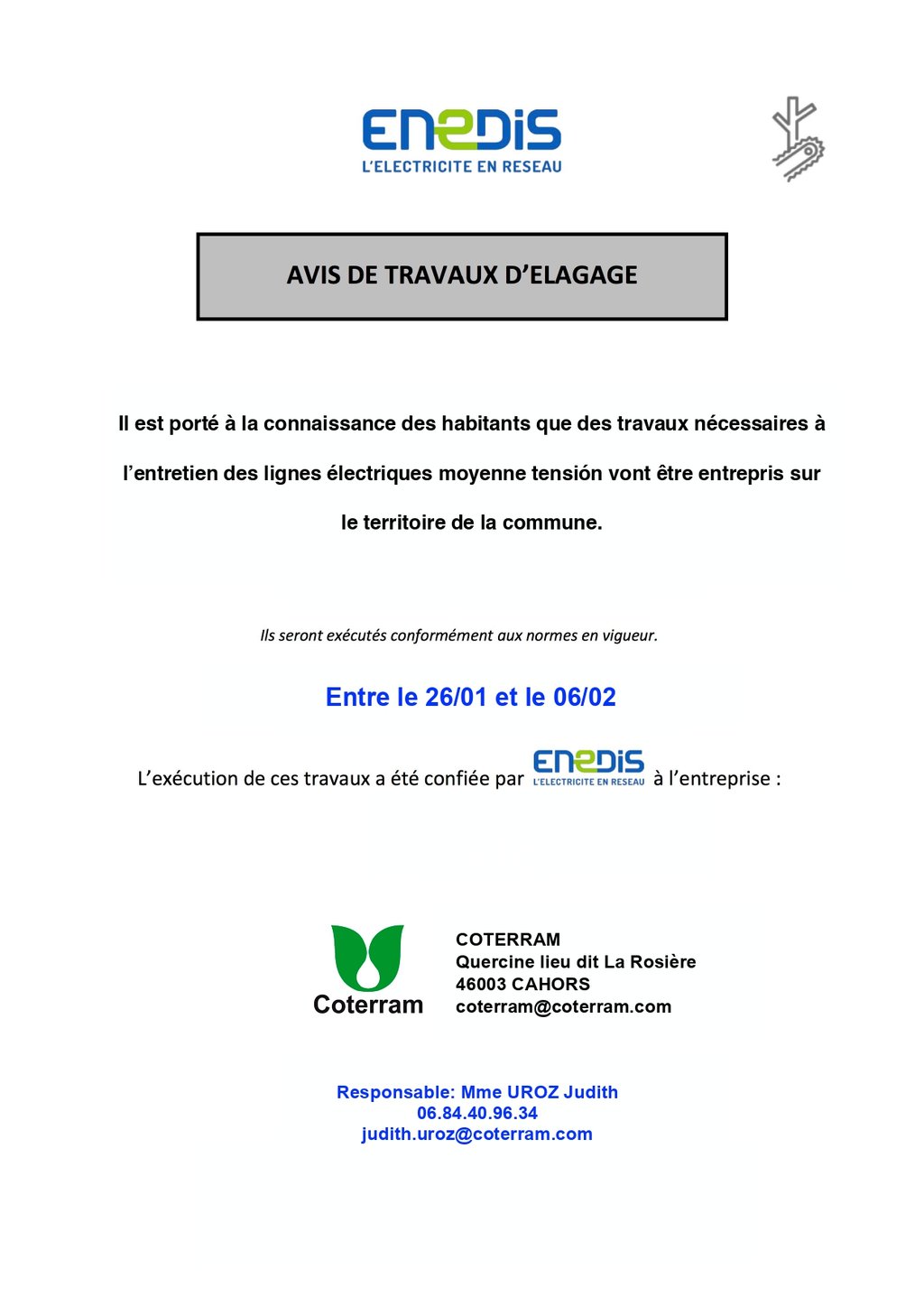 Travaux d'élagage, sur la commune entre le 26/01 et le 06/02/2026