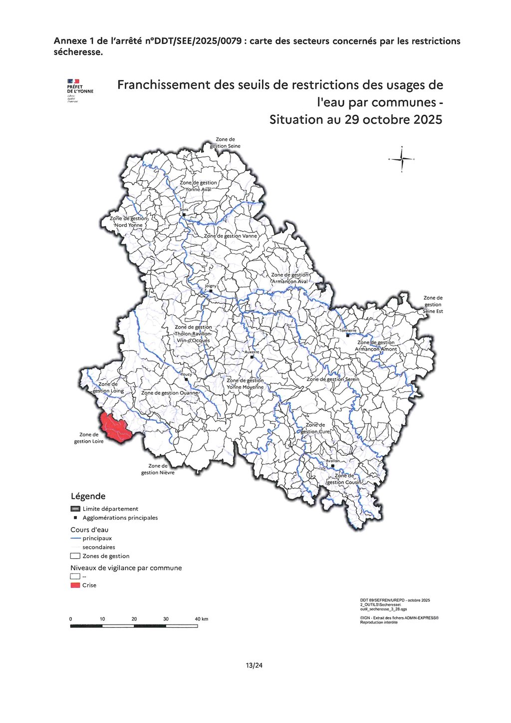 Arrêté constatant le franchissement du seuil de crise sécheresse sur la zone de gestion Loire et levant les restrictions sécheresse sur le reste du département de l’Yonne.