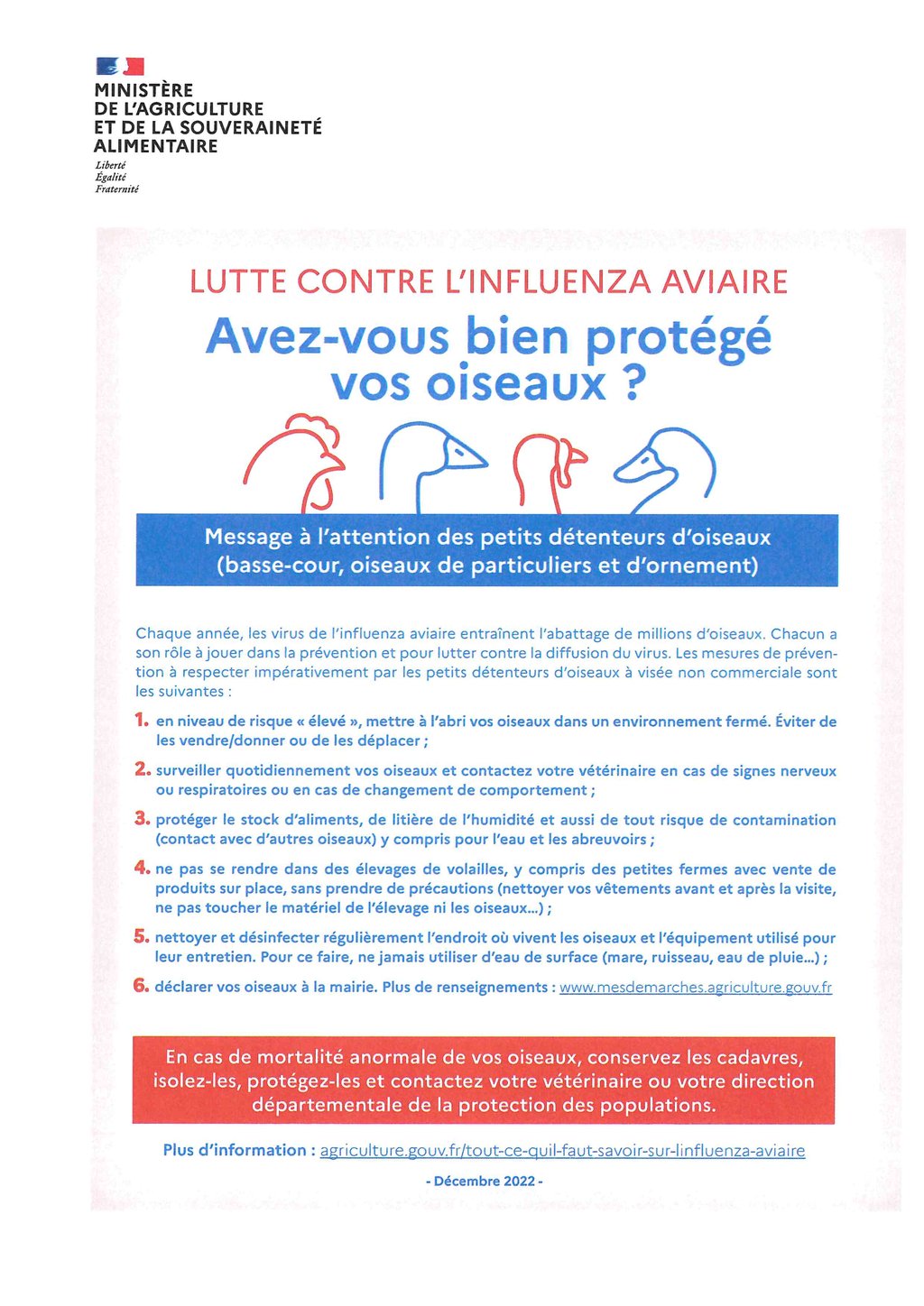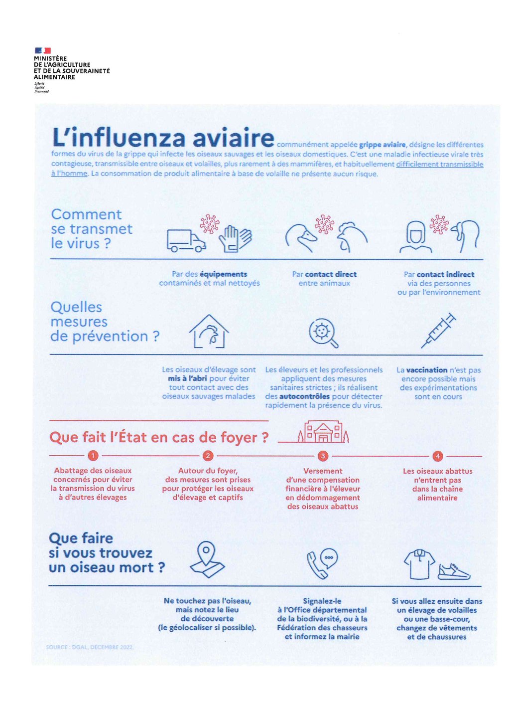 - Une fiche synthétique en ce qui concerne la transmission du virus, les mesures de prévention et les consignes liées à la collecte d'animaux morts.