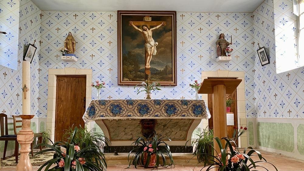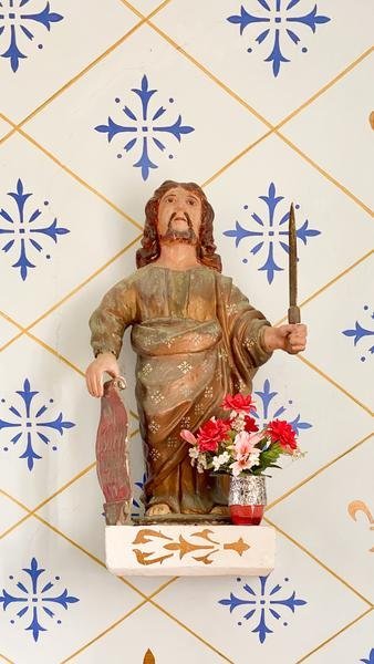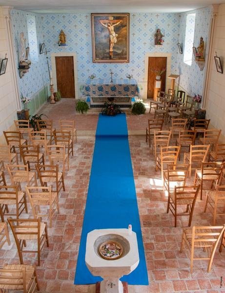 Son architecture séduit par son contraste : un clocher-mur en pierres se dresse fièrement au-dessus d’un corps crépi, tandis que deux pierres de réemploi gravées d’inscriptions latines rappellent la dédicace solennelle de l’église primitive au XIe siècle. À l’intérieur, la simplicité du vaisseau unique et du chevet droit met en valeur un mobilier sacré remarquable : croix de procession du XVIe siècle, toile signée par l’artiste parisien Gabriel Lettu, statue de Saint Barthélémy avec son couteau attribut.