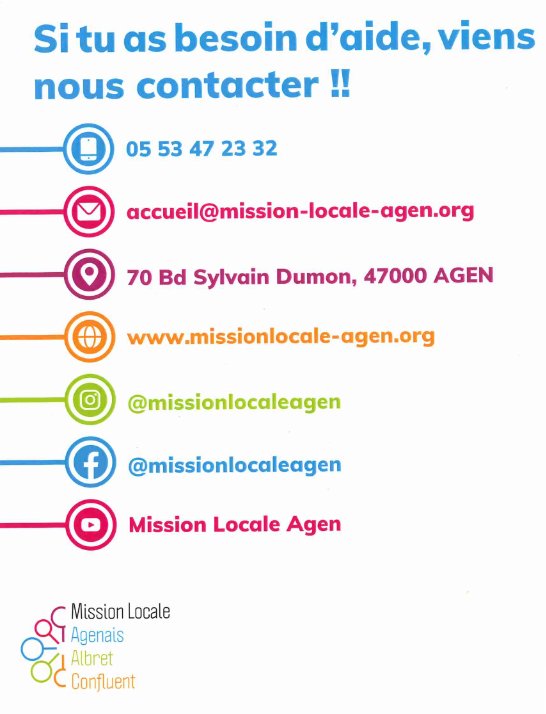 Pour tous renseignements contacter la structure au 05.53.47.23.32 ou par mail accueil@mission-locale-agen.org