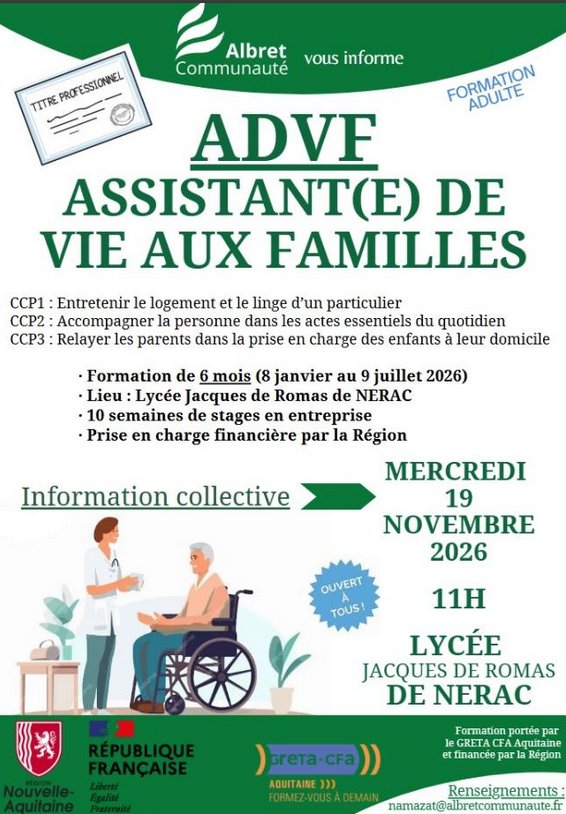 La 1ères est pour le titre professionnel AVDF : MERCREDI 19 NOVEMBRE 2025 à 11h au Lycée Jacques de Romas de NERAC