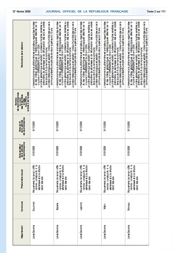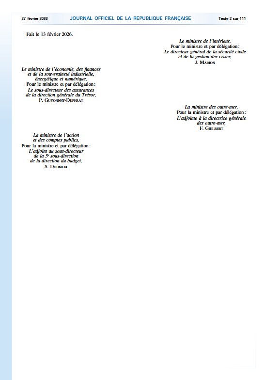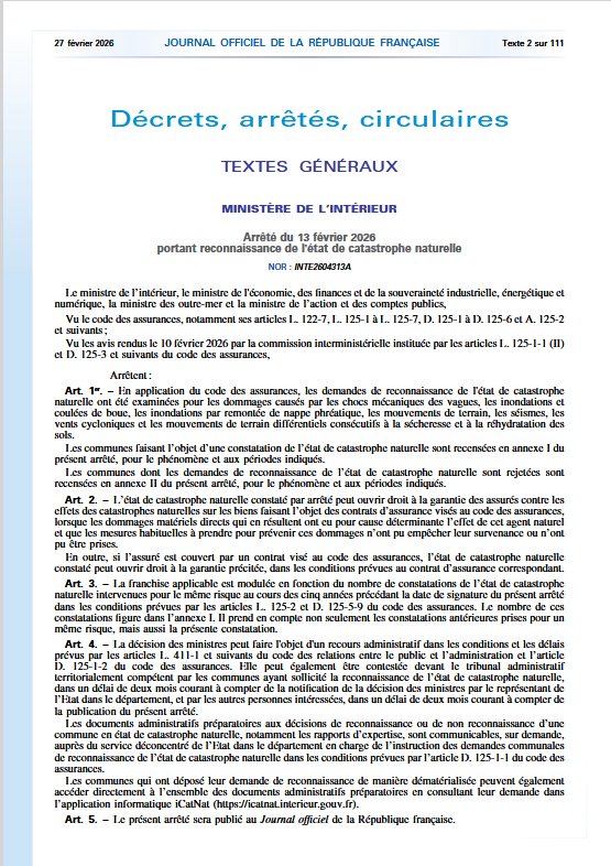 JO n°50 du 27 février 2026 - Arrêté du 13 février 2026 portant reconnaissance de l'état de catastrophe naturelle