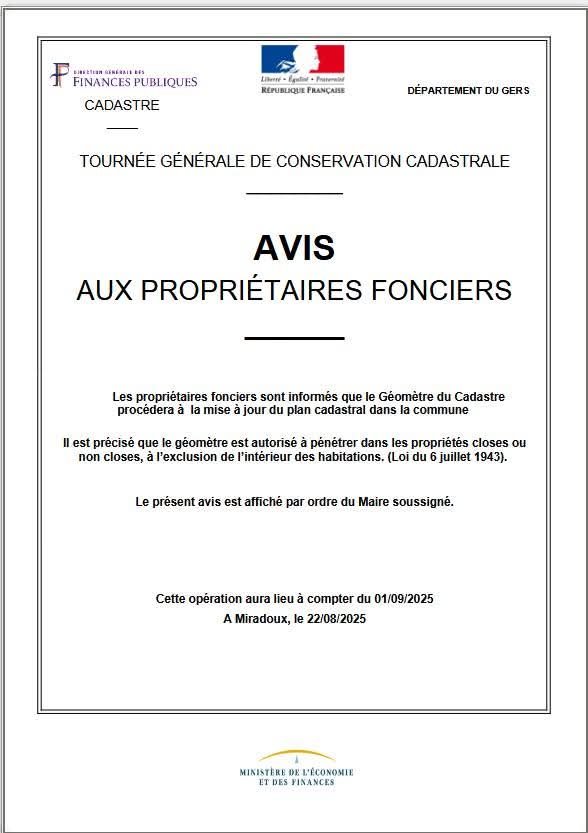 Mise à jour du plan cadastral de votre commune dans le cadre de sa tournée de conservation au titre de l'année 2025.