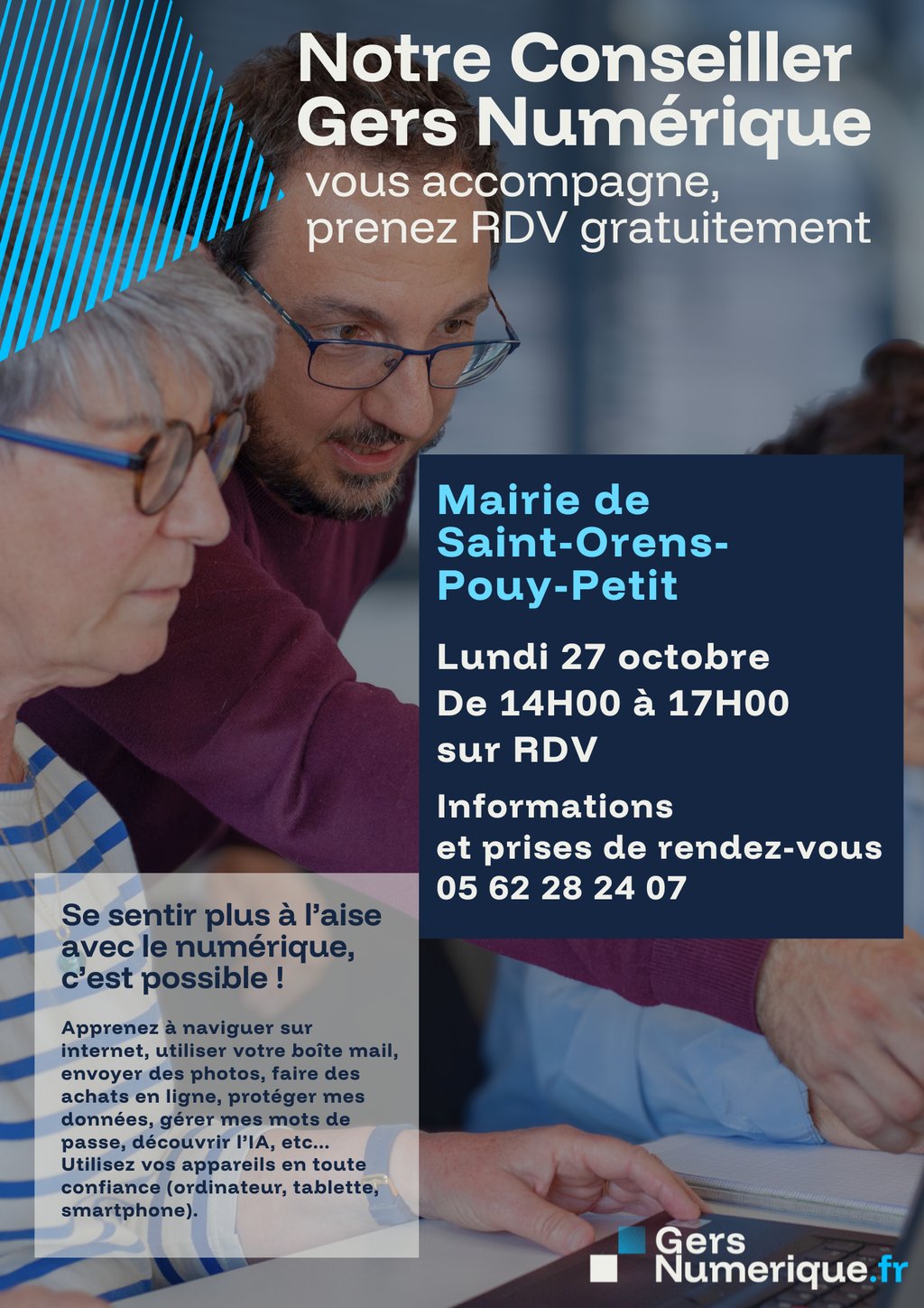 📍 Le conseiller Gers Numérique se déplace au plus près de chez vous pour vous accompagner gratuitement et individuellement sous forme d'atelier.