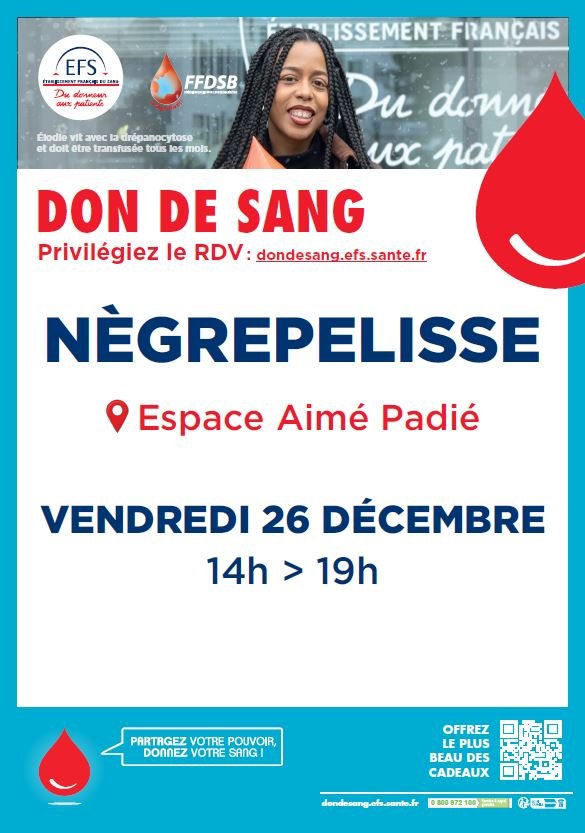 Pourquoi ne pas profiter de cette fin d'année pour venir, seul, en famille ou entre amis, offrir son sang le vendredi 26 décembre, entre 14h et 19h, à l'Espace Padié de Nègrepelisse.