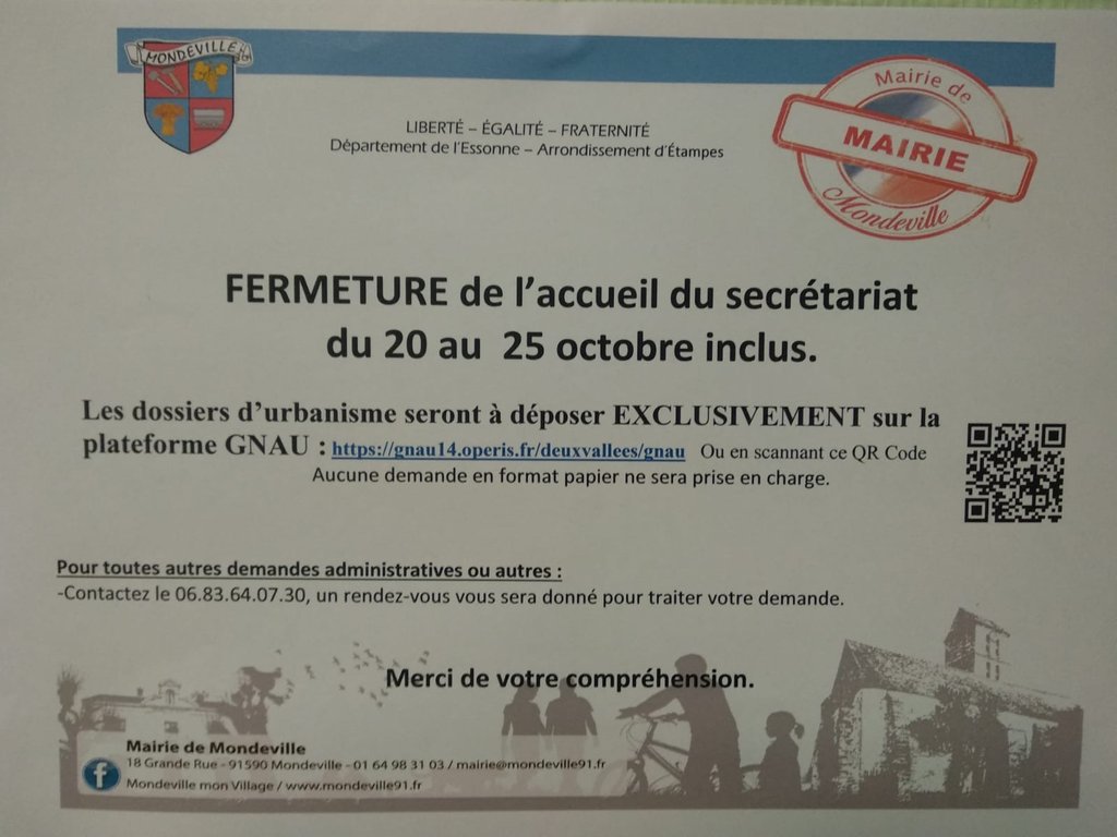 N’hésitez pas à nous contacter par mail à mairie@mondeville91.fr ou sur le portable d’astreinte au 06 83 64 07 30 pour toute demande urgente !