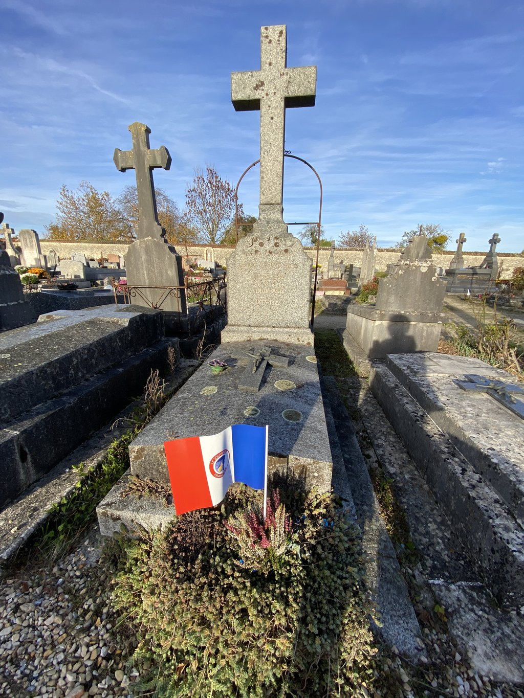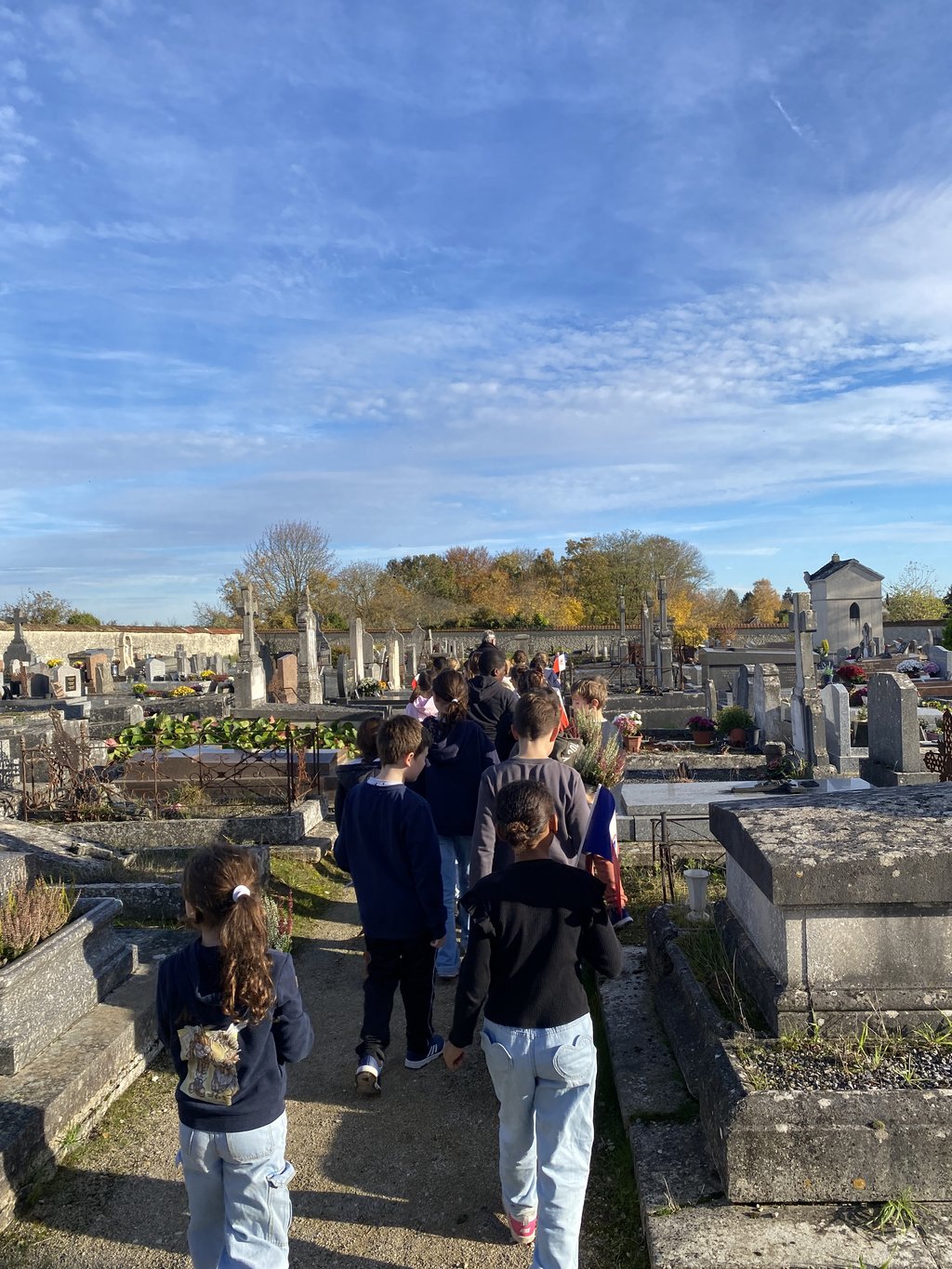 Hier après-midi, sous un beau soleil d’automne, Mme le Maire a accompagné les élèves de l’école au cimetière, en présence de M. Arnal du Souvenir Français et de M. Amiot, directeur de l’école.