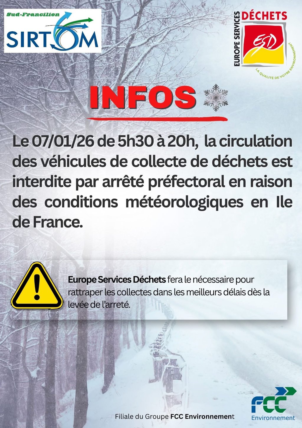 En raison des conditions météorologiques, la circulation des véhicules de collecte est interdite par arrêté préfectoral le mercredi 7 janvier 2026, de 5h30 à 20h, en Île-de-France.