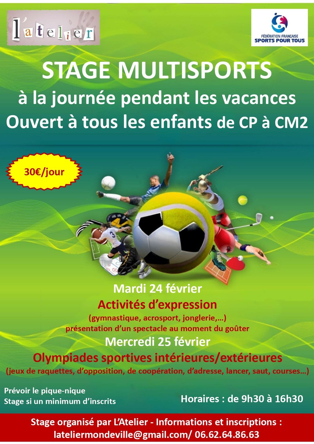 Vu le succès des derniers stages, L'Atelier propose aux enfants de CP à CM2 2 journées de stage multisport pendant les vacances de février 2026, encadrées par Arnault, notre coach historique :