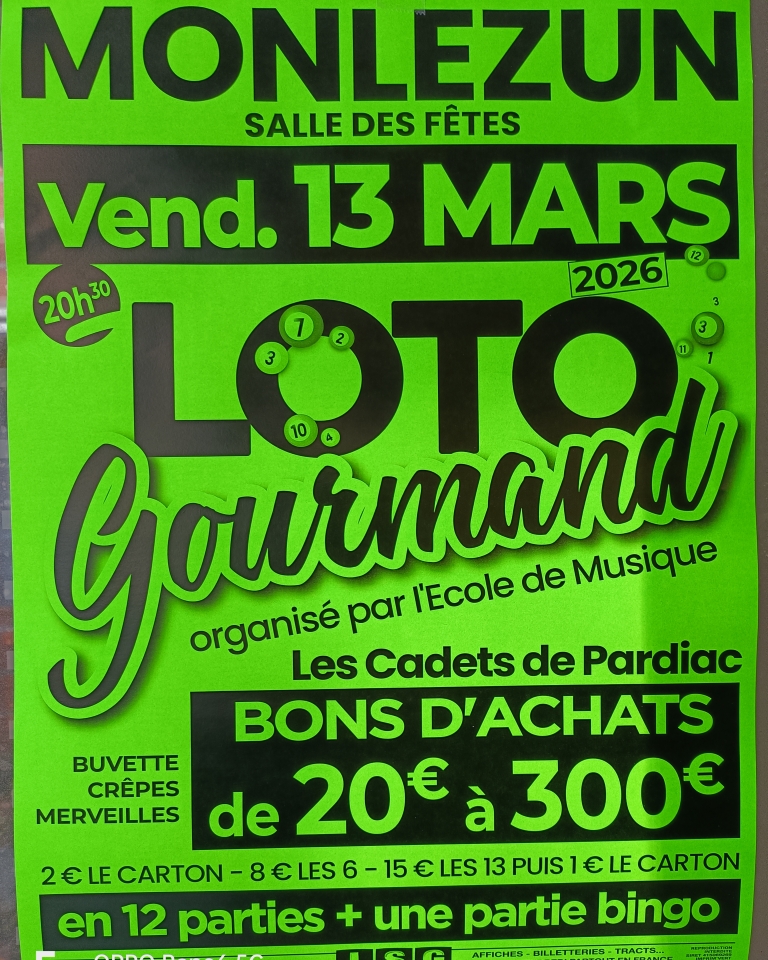 Les Cadets de Pardiac organisent un loto gourmand à la salle des fêtes de Monlezun le vendredi 13 mars 2026