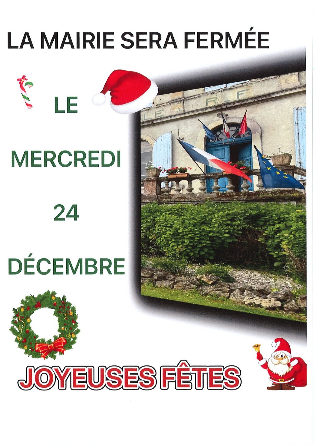 La Mairie sera fermée exceptionnellement le Mercredi 24 DÉCEMBRE.