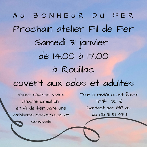 Venez réaliser votre propre création en fil de fer, que vous pourrez garder ou offrir. Aucun prérequis nécessaire. Tout le matériel est fourni. Ambiance chaleureuse et conviviale.
