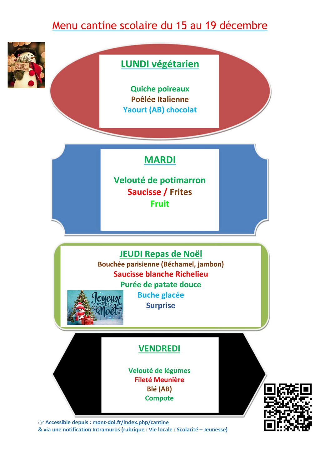 LE MENU DE LA CANTINE SCOLAIRE DU 15 AU 19 DÉCEMBRE EST EN LIGNE