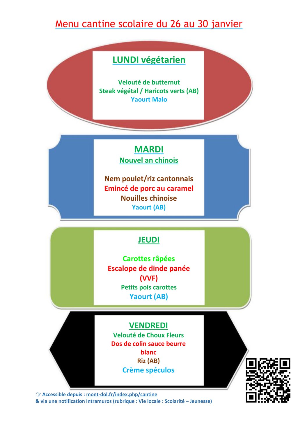 LE MENU DE LA CANTINE SCOLAIRE DU 26 AU 30 JANVIER EST EN LIGNE