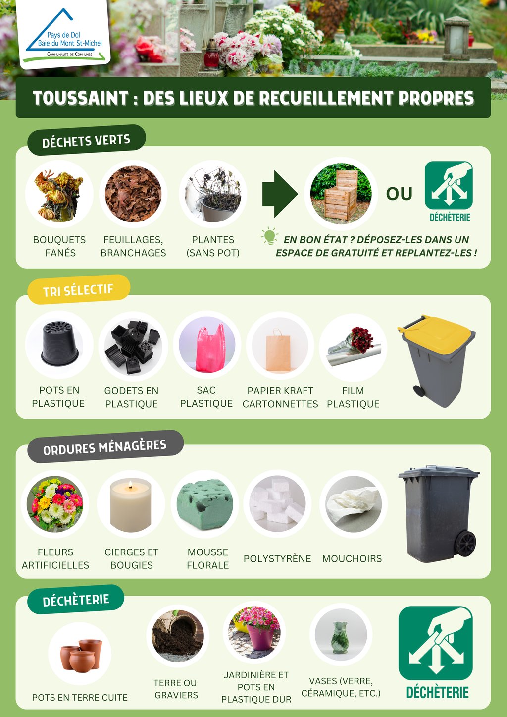 Les célébrations de la Toussaint approchent. C’est une période où chacun fleurit les tombes de ses proches, et où les déchets végétaux et d’emballage se multiplient. Afin de préserver la propreté du cimetière et de valoriser correctement les déchets, voici quelques rappels utiles sur les bons gestes de tri.