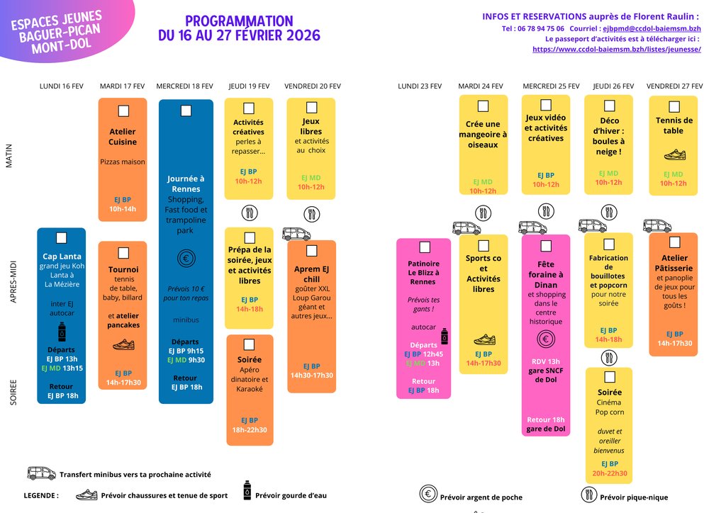 Les Espaces Jeunes de Baguer-Pican et Mont-Dol proposent un programme d’activités variées pour les vacances d’hiver, du 16 au 27 février 2026, à destination des jeunes du territoire.