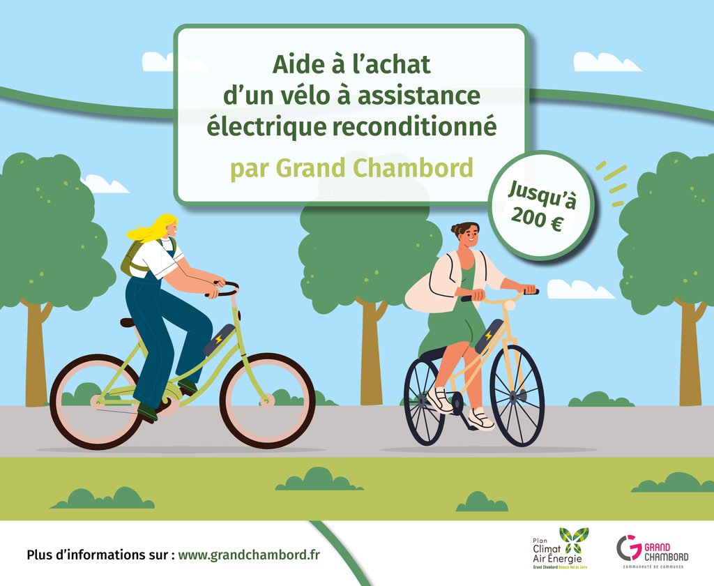 Par délibération du Conseil communautaire en date du 15 décembre 2025, Grand Chambord a mis en place, à compter du 1er janvier 2026, une aide financière pouvant atteindre jusqu’à 200 € pour l’achat d’un vélo à assistance électrique reconditionné.