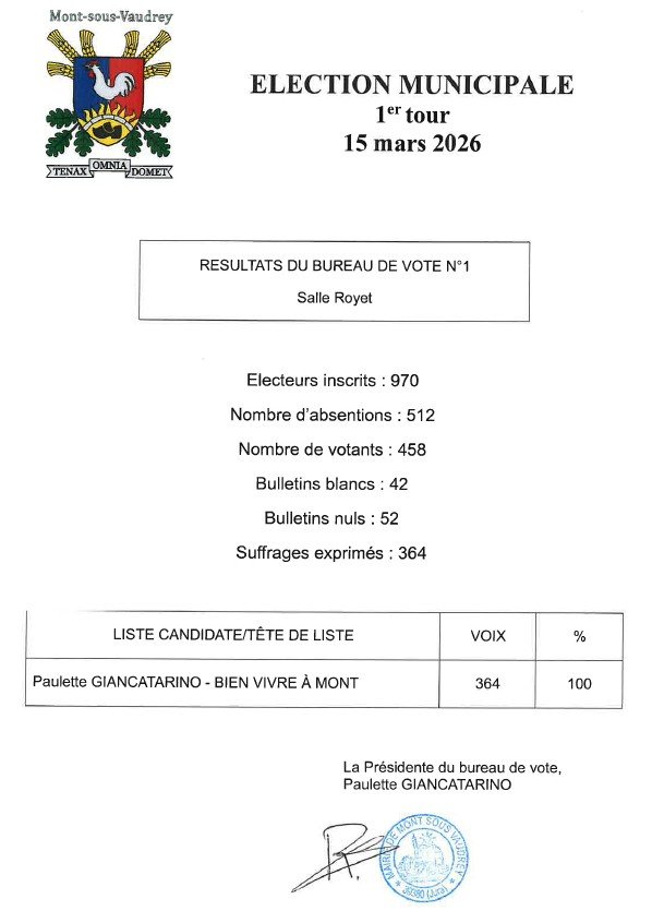 Veuillez trouver ci-joints les résultats des élections municipales pour la commune de Mont-sous-Vaudrey. Le conseil municipal d'installation (élection du maire et des adjoints) est prévu ce vendredi 20 mars à 19h30.