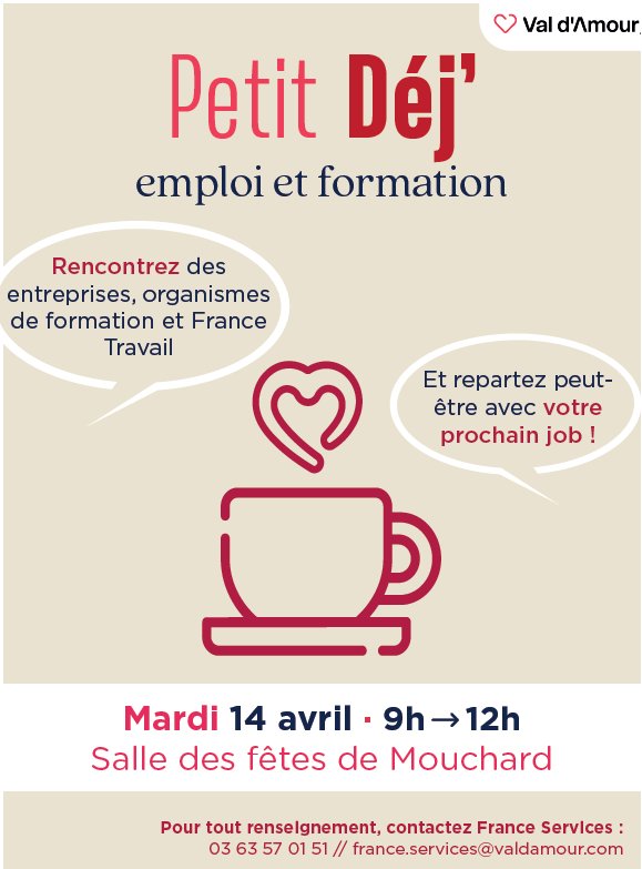 - Un petit déjeuner emploi et formation aura lieu le mardi 14 avril de 9h à 12h à la salle des fêtes de Mouchard :