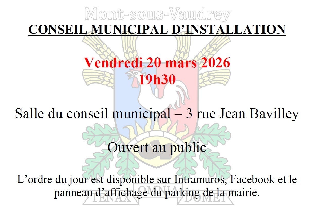 Suite à l’élection de la liste "Bien Vivre à Mont" lors des élections municipales qui se sont tenues le dimanche 15 mars 2026. Le conseil municipal d'installation se déroulera le vendredi 20 mars 2026 à 19h30.