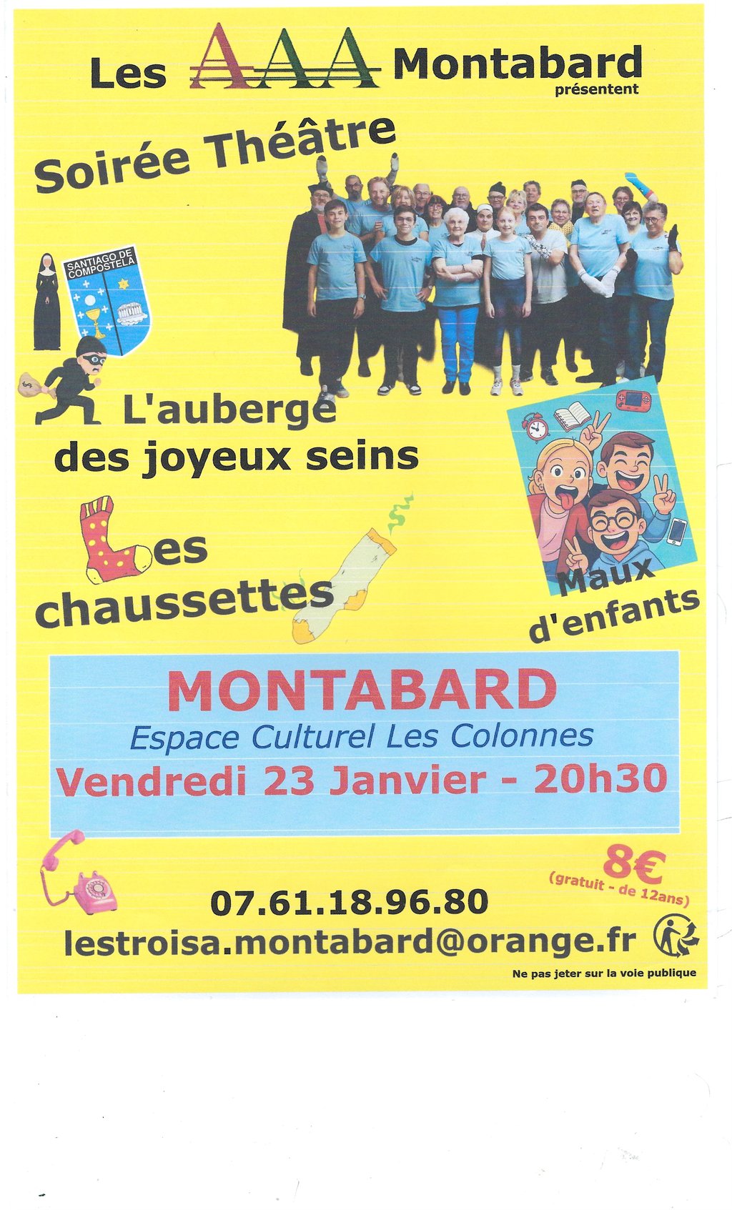 L'association les 3A Montabard présente une soirée théâtre le vendredi 23 janvier 2026 à 20 h 30 à l'espace culturel "les colonnes" par la troupe LES MOULINS A PAROLES.