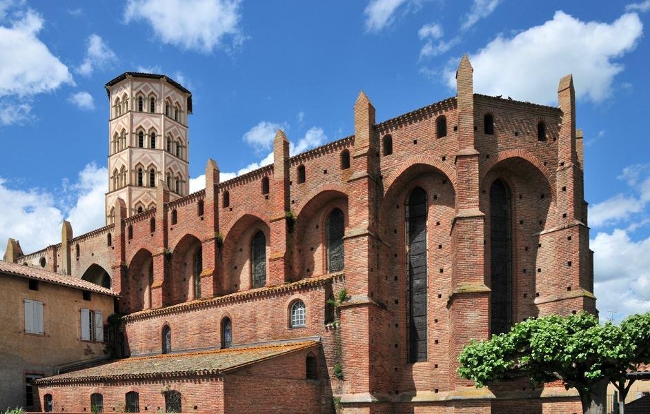 Bel exemple de gothique méridional, elle est construite du 14e au 15e siècle en briques roses. Son architecture s'inspire de l'église des Jacobins de Toulouse; la Guerre de Cent ans et les hérésies expliquent son aspect de forteresse avec contreforts massifs et chemin de ronde ainsi que la décoration succincte du porche avec tympan aveugle surmonté d'un simple gâble.