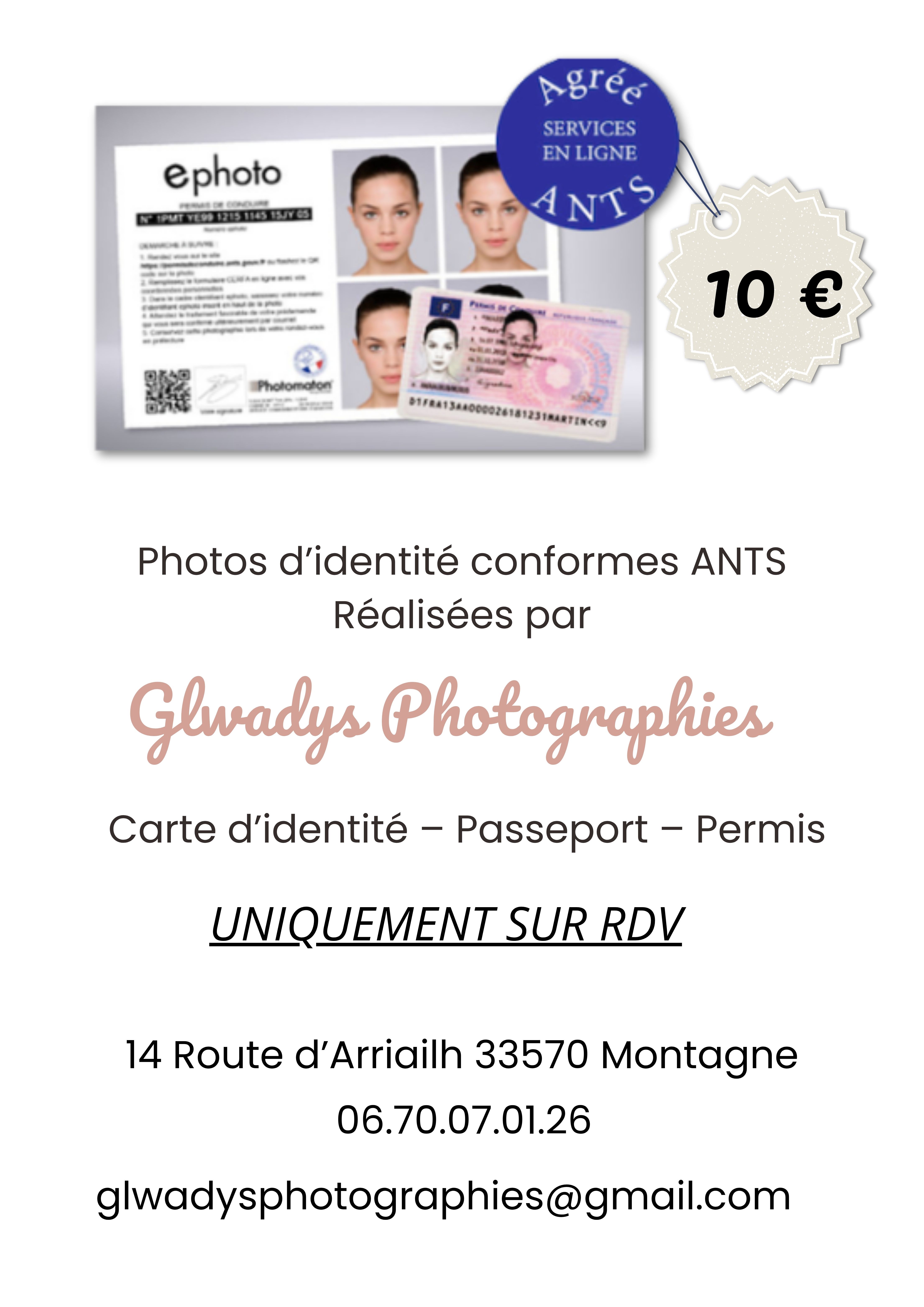 Une excellente nouvelle à partager ! Glwadys Photographies propose désormais la réalisation de photos d’identité conformes aux normes ANTS, valables pour :