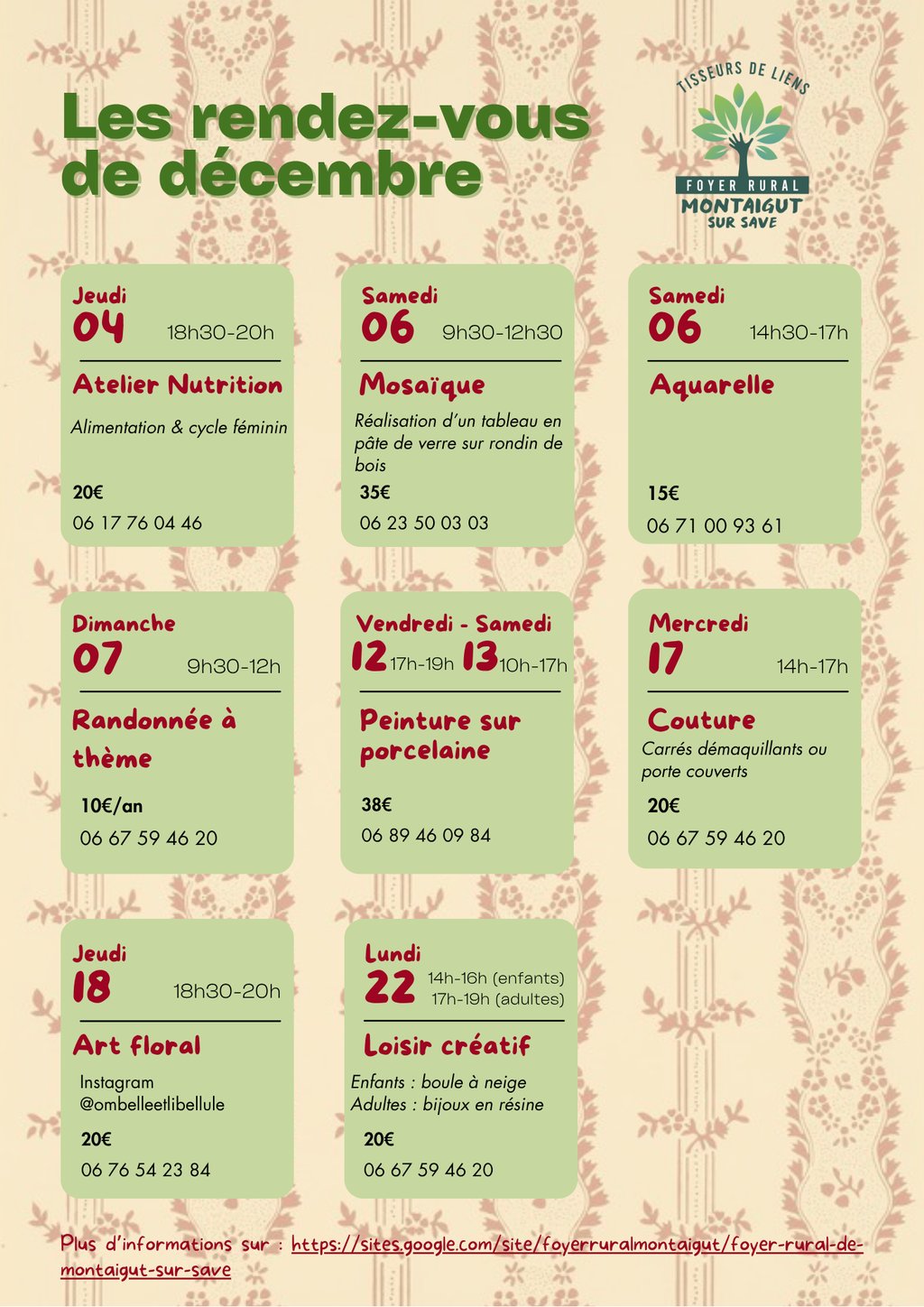 Inscription et renseignements auprès de Danielle (06 67 59 46 20). Elle vous indiquera le matériel à apporter.