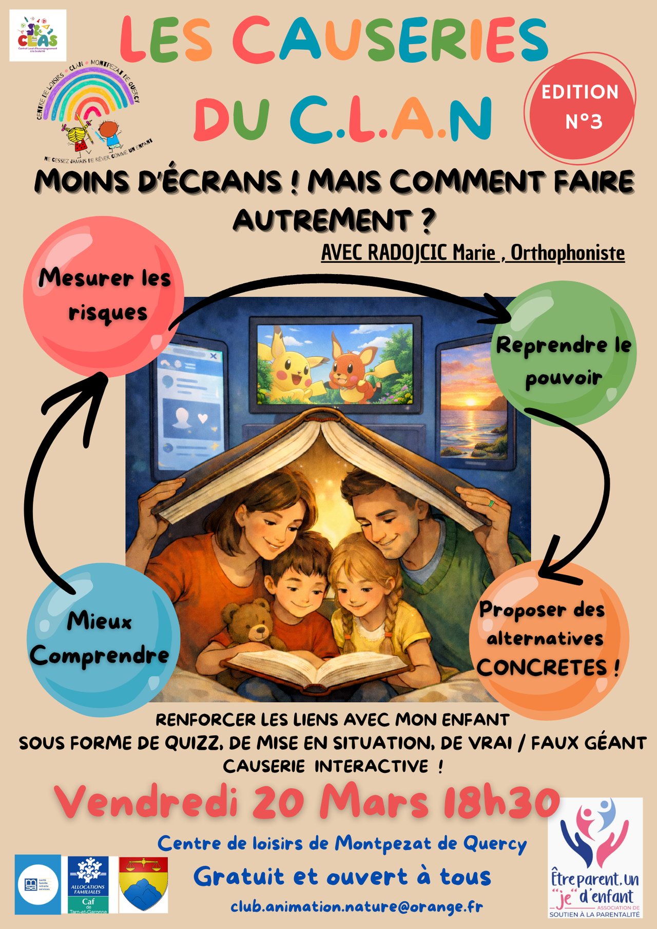Nous sommes heureux de vous proposer de participer à notre" CAUSERIE n°3", vendredi 20 mars à 18h30, au Centre de Loisirs de Montpezat de Quercy.