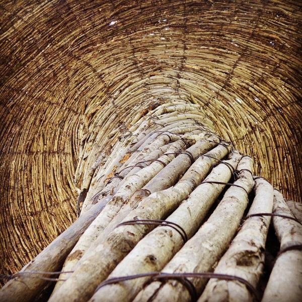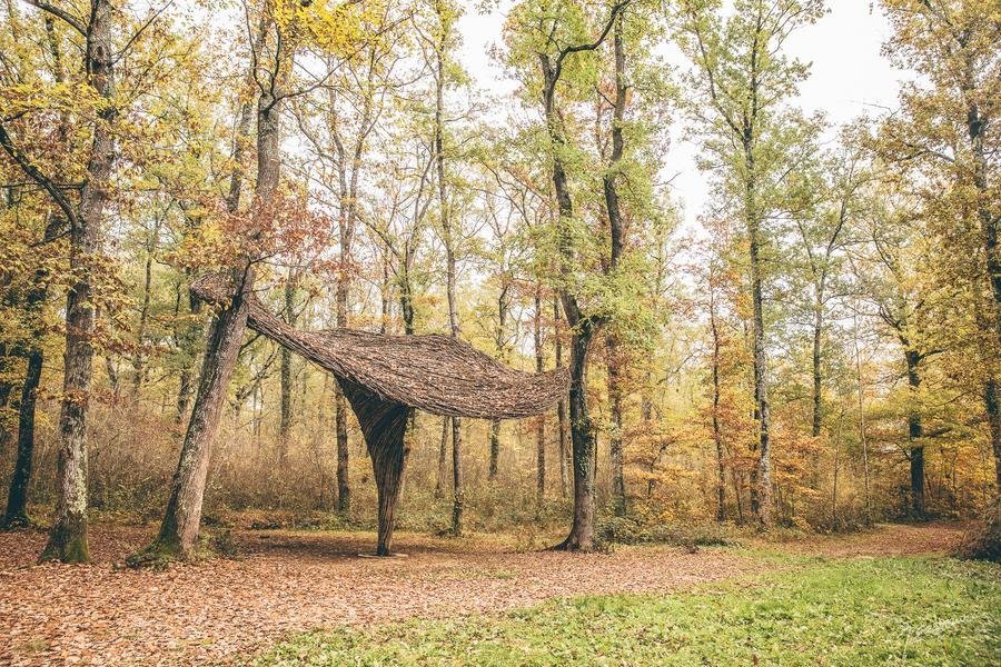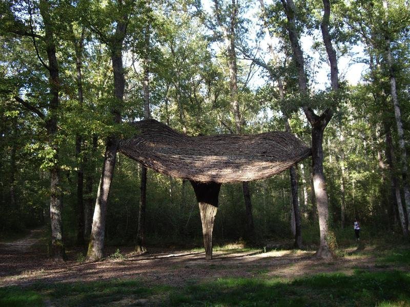 Kazé, à Saint-Elix, signifie « vent » en japonais. Cette imposante sculpture de branchages tressés évoque un cyclone prisonnier de la forêt.