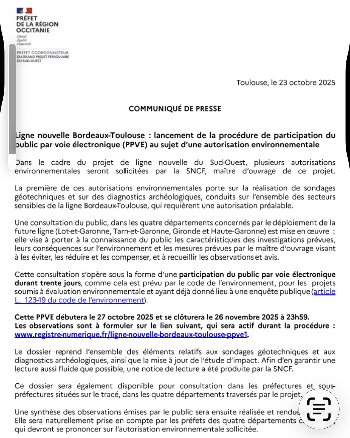 LIGNE NOUVELLE BORDEAUX-TOULOUSE : LANCEMENT DE LA PROCÉDURE DE PARTICIPATION DU PUBLIC PAR VOIE ÉLECTRONIQUE (PPVE) AU