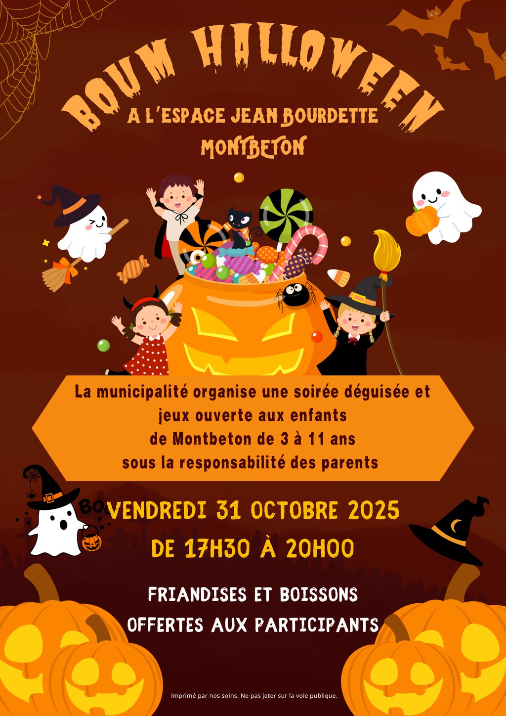 La municipalité de Montbeton invite les enfants de 3 à 11 ans à une BOUM D'HALLOWEEN à l'espace Jean Bourdette le vendredi 31 octobre 2025.