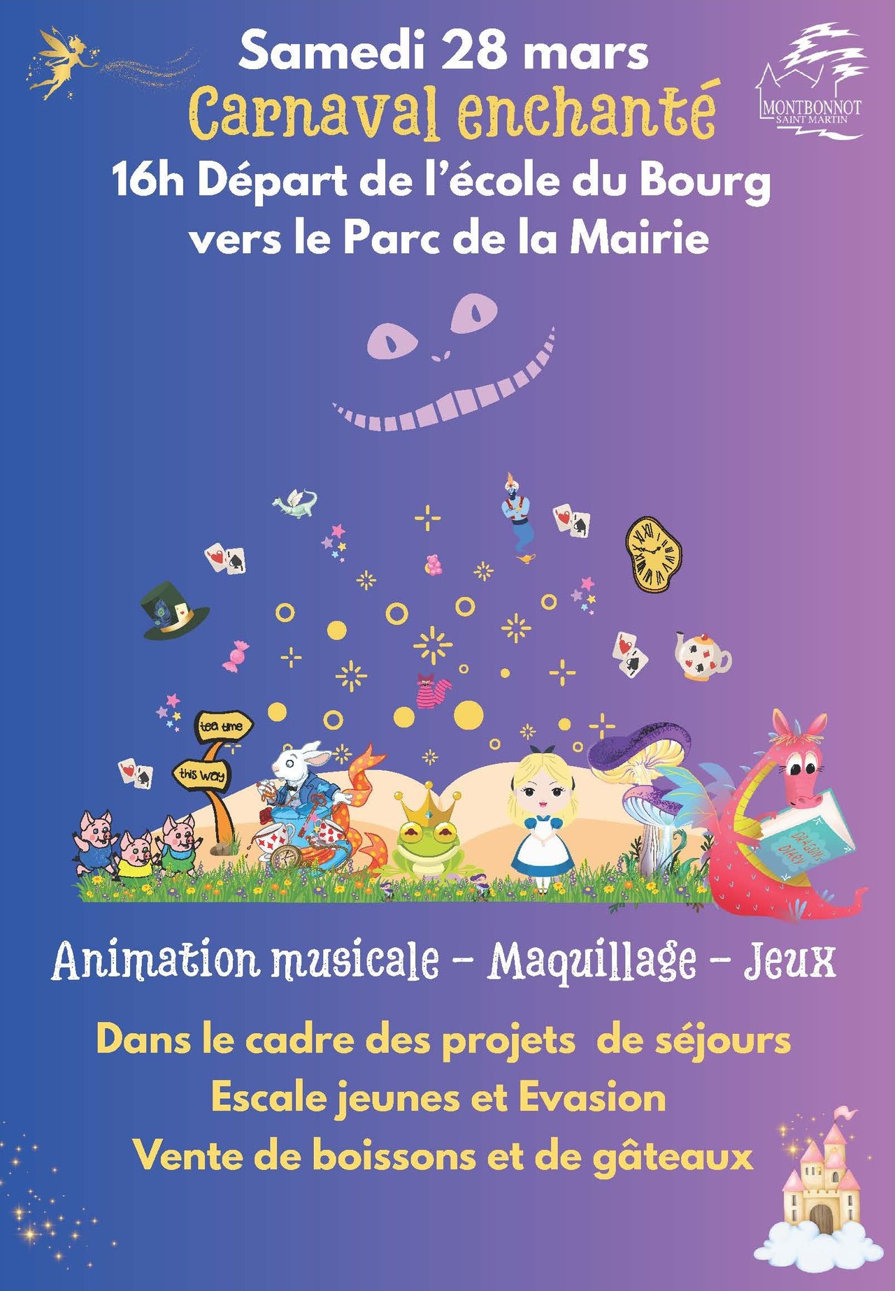 Rendez-vous à 16h à l'école du Bourg pour la parade jusqu'au Parc de Miribel (Mairie). Animations musicales, maquillage, jeux sont au programme. Une vente de boissons et de gâteaux sera proposée par les jeunes de l'Escale et d’Évasion (centre de loisirs) pour financer leurs projets de séjours dans l'année.