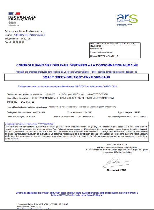 Veuillez trouver en pièces jointe les résultats des analyses réalisées le 11 septembre 2025 dans le cadre du contrôle sanitaire réglementaire.
