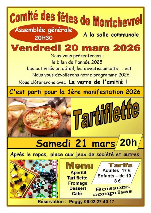 Samedi 21 mars soirée tartiflette à partir de 20h tarif : (17€ -Adultes / 8€ - Enfants - de 10 ans boissons comprises