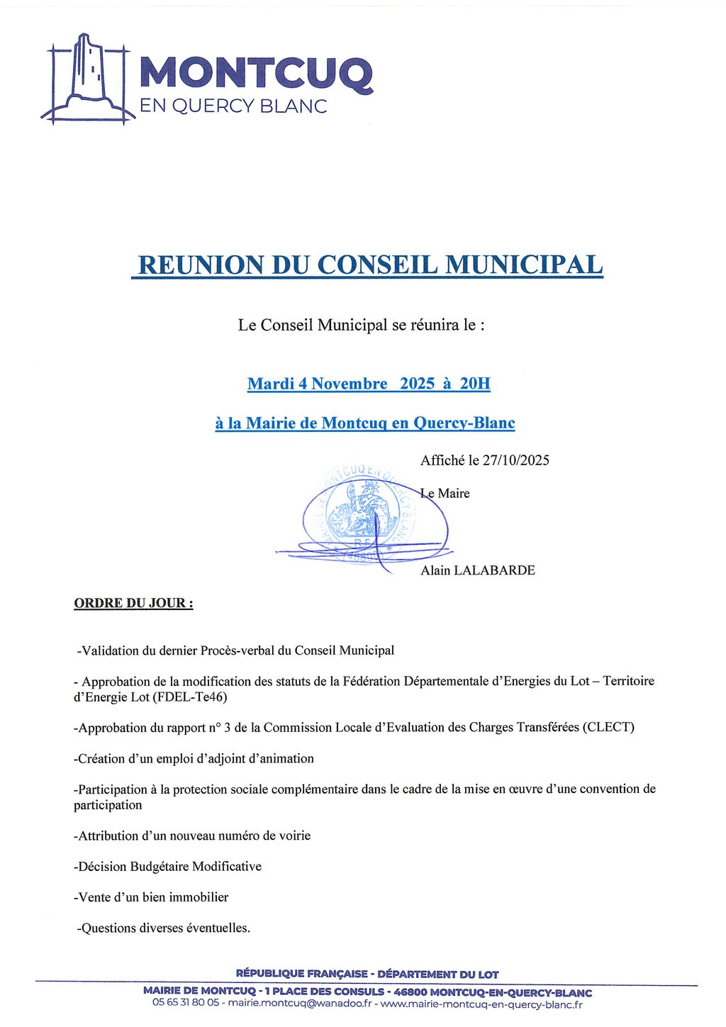 La prochaine réunion du Conseil Municipal à la mairie de Montcuq le 4 novembre 25 à 20H