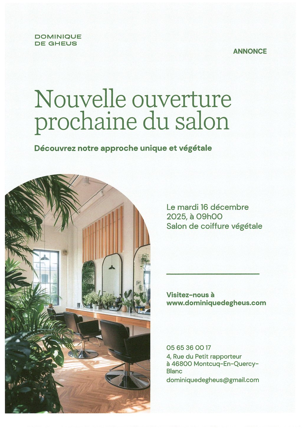 NOUVELLE OUVERTURE DU SALON DE COIFFURE LE MARDI 16 DÉCEMBRE 2025 À 9 HEURES