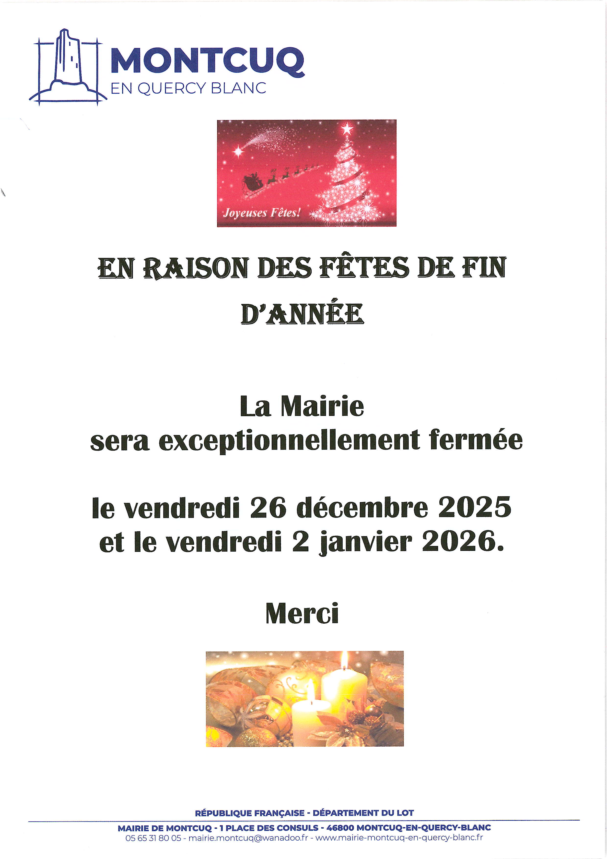 La mairie sera fermée du vendredi 26 décembre 2025 au vendredi 2 janvier 2026